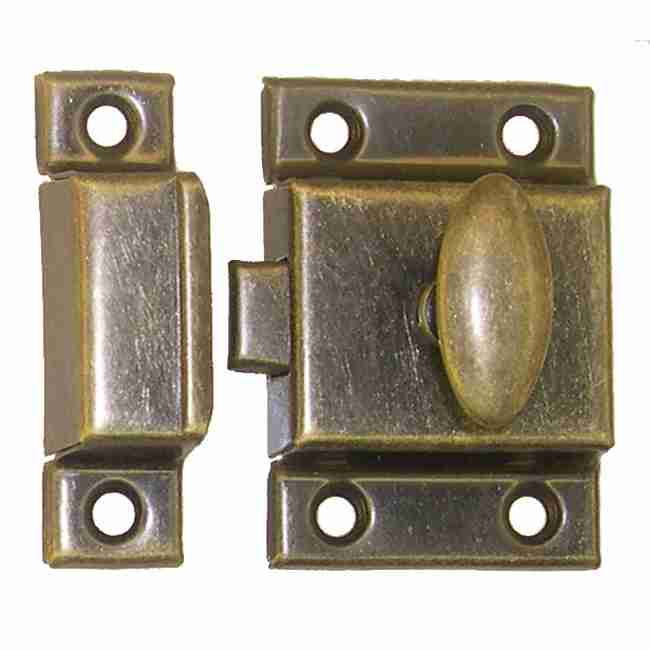 BM-1618AB… Antique brass turn latch. Cabinet and or cupboard turn latch. Antique brass plated stamped steel. Overall measuring 2-1/8″ x 2-1/8″. Catch is only 5/8″ wide. Sold individually with mounting screws.