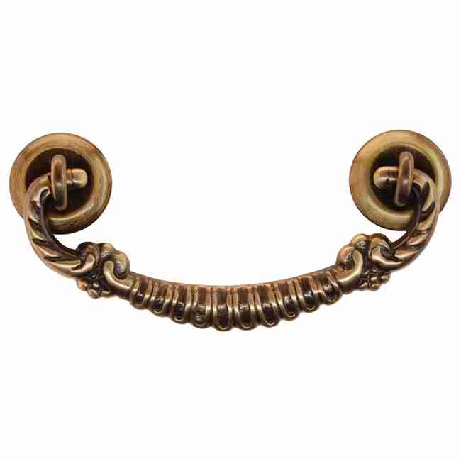 BM-1191AB …….Antique Cast Brass Victorian American Oak Bail Pull for drawers, dressers etc. Includes handle, 2 finishing washers, 2 eyelets/nuts. 3 Inch Centers. Sold individually.