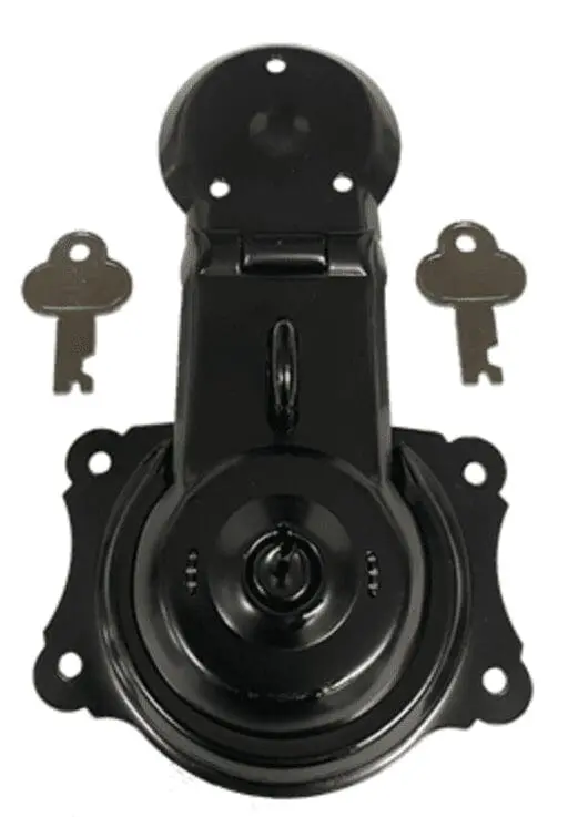 OBG-1BLK… Black trunk lock. Powder coated steel, flush mounted trunk lock. Overall measurements are 6-9/16″ long x 3-1/2″ wide and includes 2 keys. Original trunk hardware was attached with trunk nails which were about 1/4″ longer than the trunk walls thickness. Nails were bent over inside and covered with wall paper. This method was used to prevent hardware from being pulled loose during transport. Of course screws, rivets and screw post were also used. Check out our Black Trunk Hardware section, for matching hardware to fully restore your antique steamer trunk or build a brand new one! Sold individually.