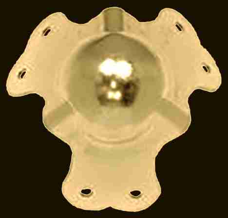 RH-1502BP… Brass ball trunk corner. Very large brass plated steel trunk corner. Thick heavy duty, super nice piece of trunk hardware. Overall dimensions are 2.5″ x 2.5″ x 2.5″ with six mounting holes that are .196″ in diameter. 14 gauge steel that has been brass plated. A ball corner is designed to allow a square cut trunk corner to fit without having to round off the edge of the wooden trunk corner. Sold individually.