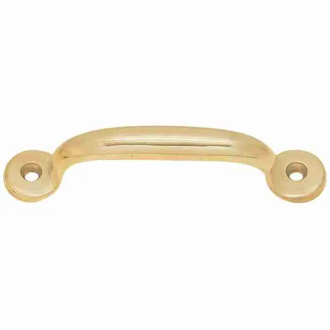 BM-1130PB… Brass Hoosier pull. Brass plated steel Hoosier type drawer pull or also referred to as a bin pull. Overall measuring 3-1/2″ long x 5/8″ wide with 3″ centers. These were very popular for Hoosiers cabinets but can certainly be used on any piece of furniture new and old that needs a simple drawer pull. Sold individually with mounting screws.