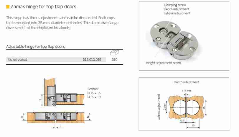 Good hinges, robust, but unfortunately did not fit my desk front flap. This particular hinge is not adjustable in the in/out direction. Since I am replacing existing hinges that are broken, I need adjustable hinges to fit pre-existing bores for the hinges. These hinges are shorter in the in/out direction, and not adjustable. These hinges would work fine if you are boring new holes for them.