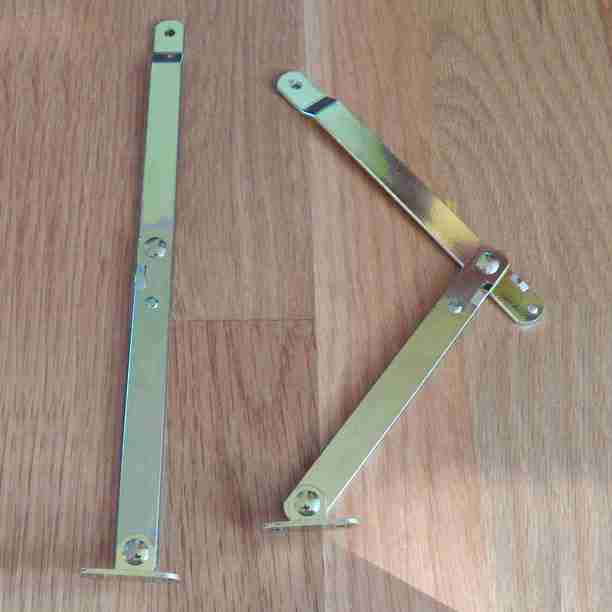 LS-5PBHERSH… Folding support hinges. Pair of brass plated steel drop front desk Lid Supports for drop front secretary. These are also popularly used on for chest lids, but can be used on anything that you need a folding support for. Overall measuring 10-1/2″ long end to end. They are 10 inches long when open from center of screw hole to bottom of foot. Bar is approximately 9/16″ wide. Screw holes in foot are approximately 7/8″ on center. Locks in place when fully opened. Sold in pairs of two with mounting hardware.