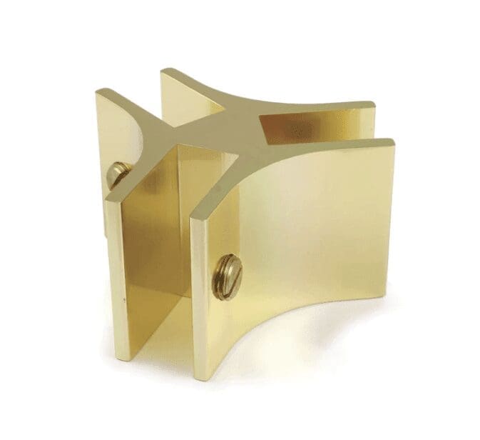 XGLASS103P…. Glass assemblies made of extruded solid aluminum in Brass Finish for 3 way connection. Made for 3/8″ thick glass or panels. Nylon backed set screws tighten to secure glass.. 1-1/2″ high x 2-1/4″ at widest. Perfect for mobile displays, they allow rapid assembly and disassembly, and glass or panels can be shipped flat. Sold by the Each.