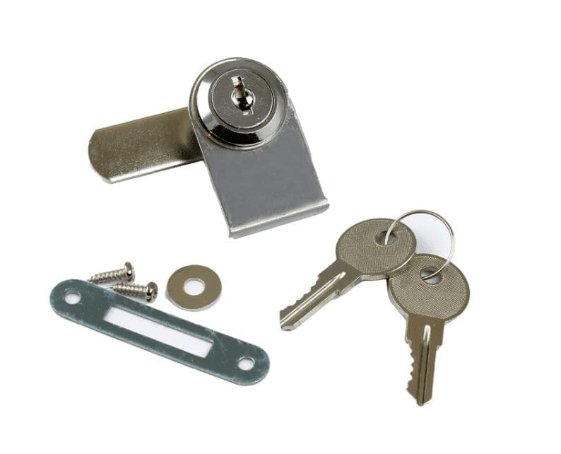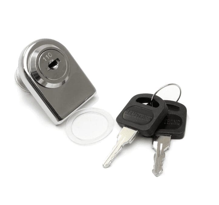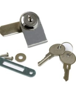 LGL-200K… Sold by the Each. Chrome Finish Glass Door Camlock. Fits in 3/4″ hole in glass 30mm from edge of glass. Cylinder fits through 1″ wide cover plate. For glass 3/16″-1/4″ thick. Can protrudes 1/4″ in closed position, engaging (2-1/4″ x 15/32″) oval strike plate. Cam length is 1-3/8″. 90 degree key turn. Key removable in closed position. Includes lock, cover plate, strike plate, nylon washer, lock-nut, cam with fixing screws, 2 keys.