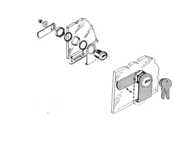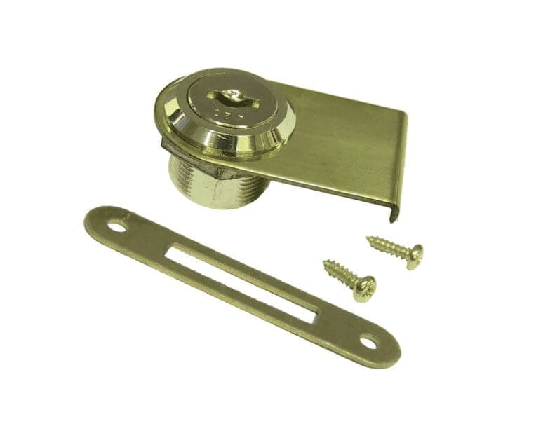 LGL-200P… Sold by the Each. Brass Finish Glass Door Camlock. Fits in 3/4″ hole in glass 30mm from edge of glass. Cylinder fits through 1″ wide cover plate. For glass 3/16″-1/4″ thick. Can protrudes 1/4″ in closed position, engaging (2-1/4″ x 15/32″) oval strike plate. Cam length is 1-3/8″. 90 degree key turn. Key removable in closed position. Includes lock, cover plate, strike plate, nylon washer, lock-nut, cam with fixing screws, & 2 keys.