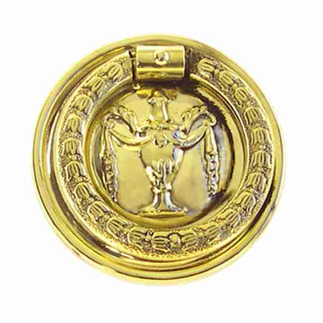 BM-1451PB…Hepplewhite ring drawer pull. Stamped brass “Urn” ring drawer pull. Overall this round drawer pull is 1-3/4 inches in diameter. Attaches with 1 machine screws from the rear, near the top of the pull from where ring hangs. These pulls can be given an antique finish with our darkening solution K-M3 . Solution is easy to use and gives brass hardware that aged antique look. We also carry a matching pull BM-1453PB. Stamped Brass is thin sheet brass which is stamp embossed and die cut. Sold by each.