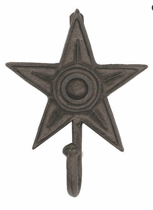 UDX-1100.. Cast Iron Star Hall Tree Coat Hook in a rusted finish. Hook is 7-1/2 inches high x 5 inches wide. Front Mount, hung with keyhole hanger which in on the back of the star. Sold individually.