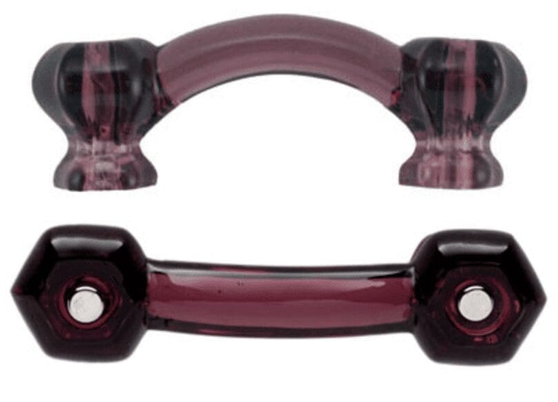 BM-5195.. Purple Amethyst glass drawer pull. Depression glass pull. 3 Inch Centers 1-1/4 Inch Projection, Two Nickel Plate Screws. Sold individually. We also carry different color, depression glass drawer pulls, you can see here!