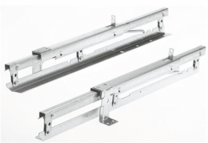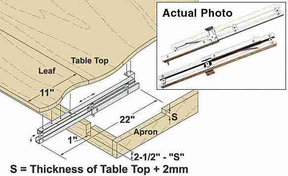 X-4PZ… Refectory table lifts. Pair of slide out pull up refectory table end extenders for table leaf storage. Table end extender for 11″ extension. Pair will accommodate one leaf for each end of one table. Telescopic table extender brings extension out from under the table top and automatically locks them up into place on a spring activated pop-up mechanism. Adjustable, easy to install, all steel, anti-rust plated. Minimum length of the fixed top is 31-1/2″ and is made for tops that are 5/8″- 1″ thick. Sold in pairs.