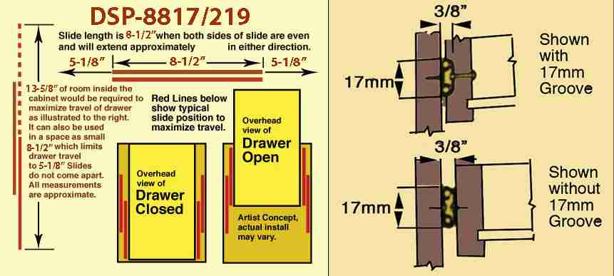 Precision-rolled steel channels fitted to steel ball-bearings in a nylon carrier insure a vibration free, smooth-as-silk, rolling action for lighter drawer loads, desk trays, shelves, computer pullouts. Especially preferred for drawers with 17mm side grooves. All holes on 32mm centers. May be attached with wood screws from the outside or with M4 machine screws from the inside into pre-tapped holes. No Lefts or rights, so they are reversible. Travel exceeds length of slide. Most often the DSP-8817 series drawer slide will fit most Ikea products!