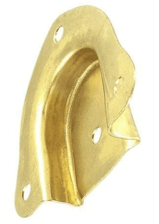 OBL-1771BP… Spade trunk handle cap. Brass plated steel for leather trunk handles. Two caps need to be ordered for each handle. Cap measures 2-1/2″ wide x 2-1/4″ long overall. Attachment nails must be ordered separately, you can see our trunk hardware section HERE. This Cap works great with KD-TKH91 & KD-TKH92 or any other handle of similar size and shape. Slotted is preferred but un-slotted works just as well, but the handle needs to be positioned bent out so your hand fits behind it. Original trunk hardware was attached with trunk nails which were about 1/4 inch longer than the trunk walls thickness. Nails were bent over inside and covered with wall paper. This method was used to prevent hardware from being pulled loose during transport. Of course screws, rivets and screw post were also used. Sold individually.