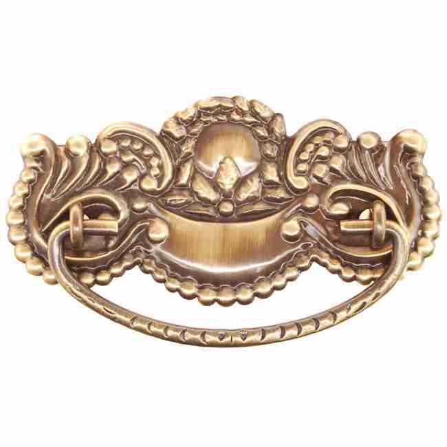 BM-1151AB… Stamped Victorian drawer pull. Antique brass American Oak stamped brass pull. Overall measurements: Backplate is 4-1/2″ x 2-1/4″ with 3″ centers. Included in the package are two eye bolts, one stamped brass backplates and one cast brass bail. Sold individually.