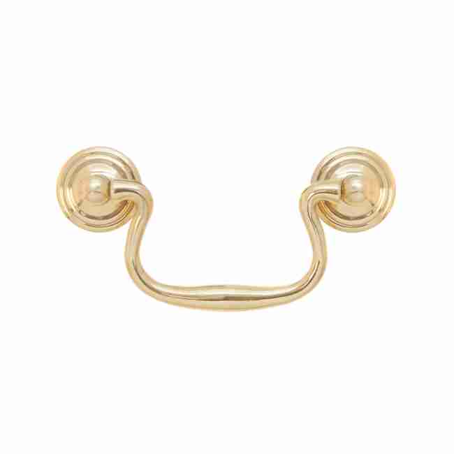 BM-1121PB… Swan neck bail pull. Queen Ann style bail pull in cast brass. This pull has 3″ centers with a polished brass finish. The backplates are 1″ in diameter. Sold individually with mounting hardware.