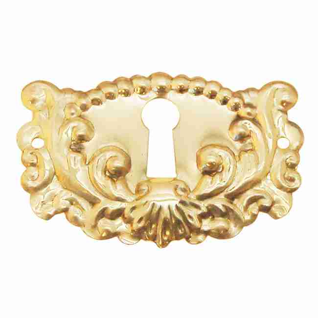 BM-1207PB Horizontal Stamped Brass Victorian Keyhole Cover. 1 1/4″ High x 1 15/16″ Wide. Stamped Brass is sheet brass stamped embossed and die cut, many people say they look cheap but it is the way they were made for furniture around the turn of the century. They can be given an antique look with our darkening solution J-3498. Keyholes sold by each.